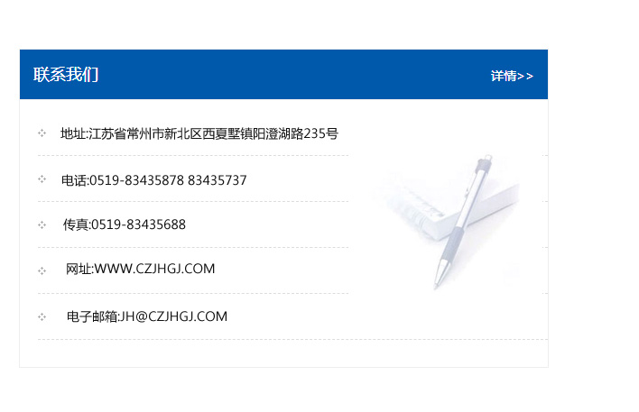 地址:常州市新北區友邦商務大廈1幢16、17層  電話:0519-85101652  傳真:0519-85112595  郵編:213022  網址:www.cz-jiayue_cn.china-jls.com  郵箱:xiajifengaa@163.com